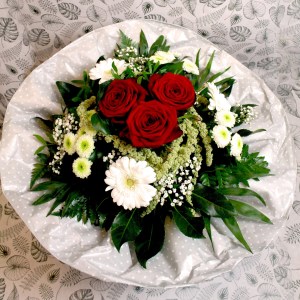 - Strauss kompakt gebunden mit Rosen, Saisonblumen und Grün in 3 Grössen.